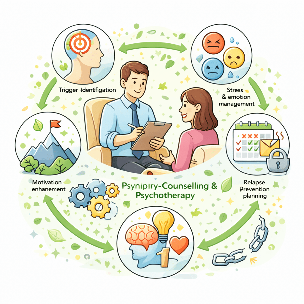 Behavioural therapy Trigger identification Stress and emotion management Motivation enhancement Relapse prevention planning -