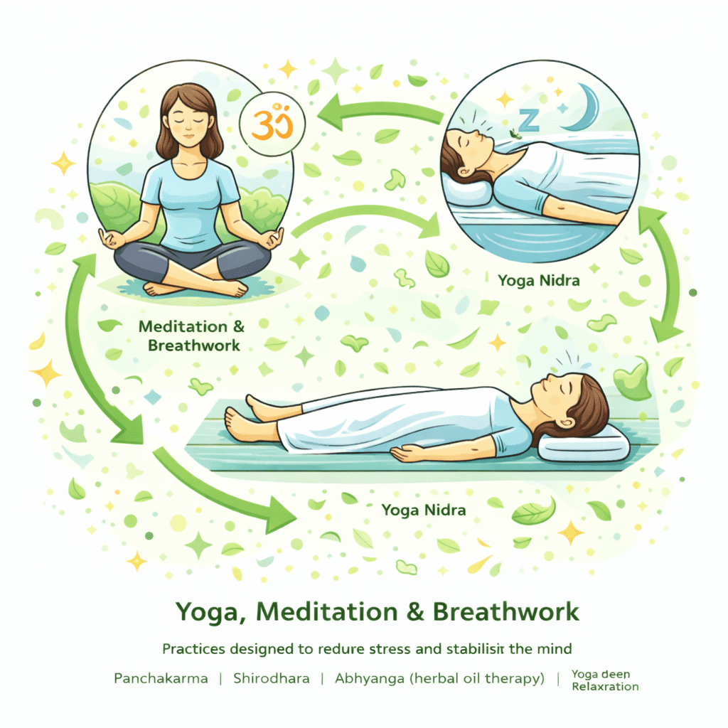 Practices designed to reduce stress and stabilize the mind Breathwork for emotional control Yoga Nidra for deep relaxation -
