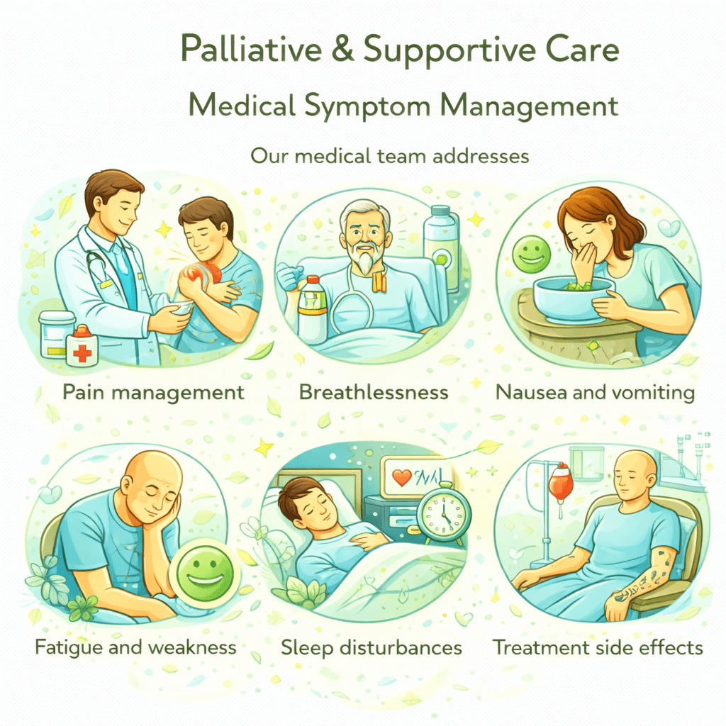- Management of nausea, fatigue, digestion issues, and breathlessness