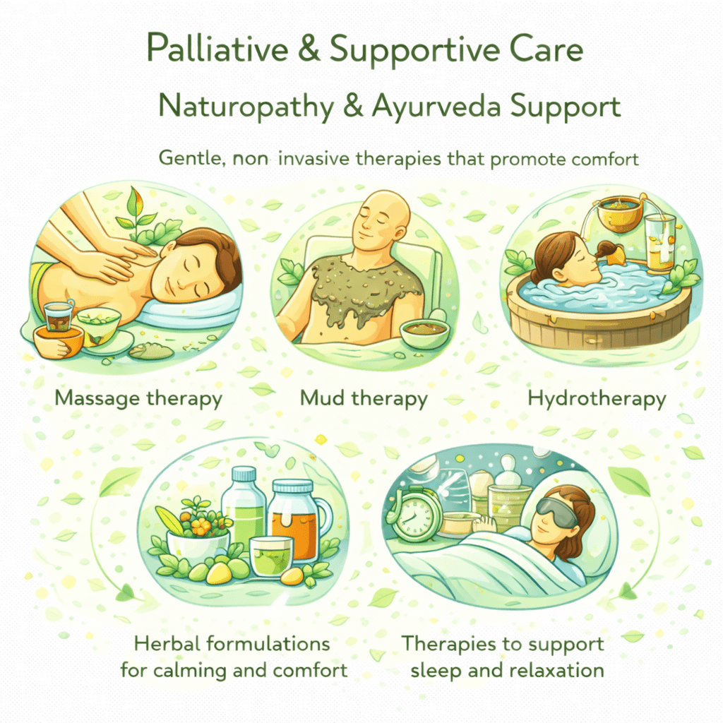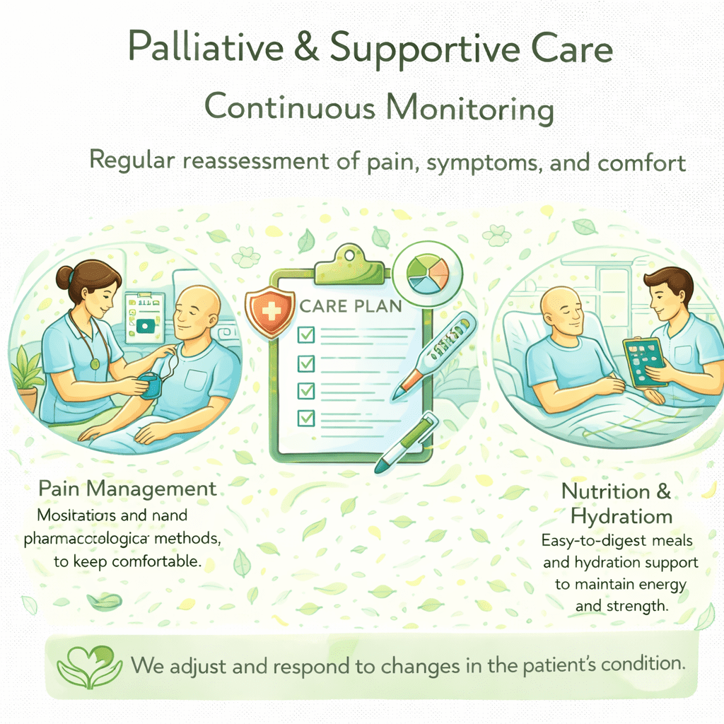 We offer relief from pain, discomfort, emotional distress, and treatment-related side effects through an integrated care approach combining Allopathy, Naturopathy, Ayurveda, Physiotherapy, Yoga, Mental Health Support, and Nutrition.