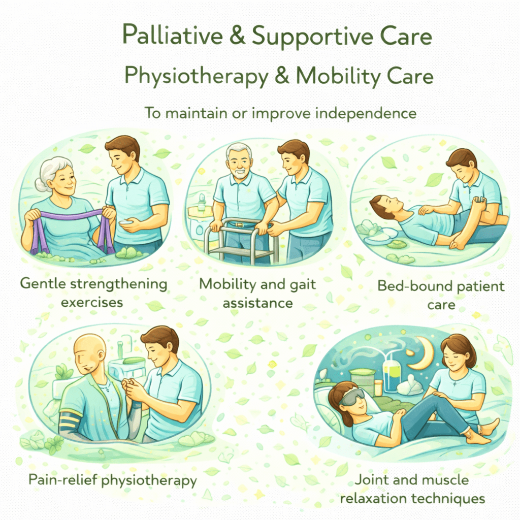 Gentle strengthening exercises Mobility and gait assistance Bed-bound patient care Pain-relief physiotherapy Joint and muscle relaxation techniques -