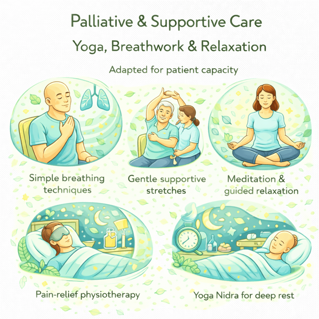 Simple breathing techniques Gentle, supportive stretches Meditation & guided relaxation Yoga Nidra for deep rest -