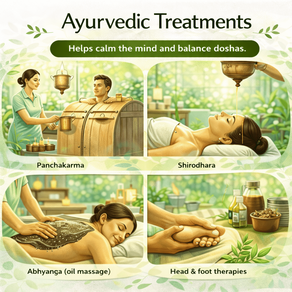 Panchakarma Shirodhara Abhyanga (oil massage) Head & foot therapies Herbal calming therapies -