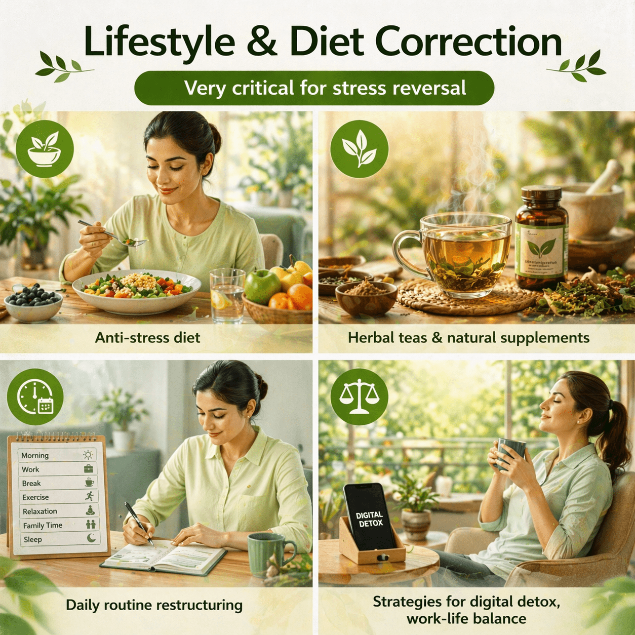 Anti-stress diet Herbal teas & natural supplements Daily routine restructuring Strategies for digital detox, work-life balance