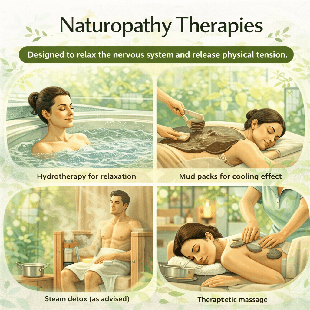 Hydrotherapy for relaxation Mud packs for cooling effect steam detox (as advised) Therapeutic massage -